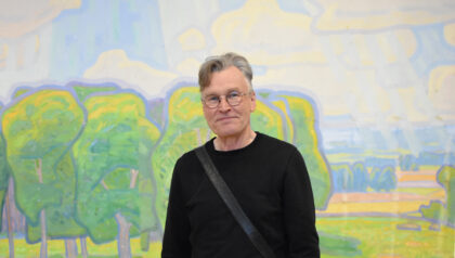 Matts Leiderstam framför en av Prinsens förstudier till Soltavlan. Foto av Kerstin Lager.
