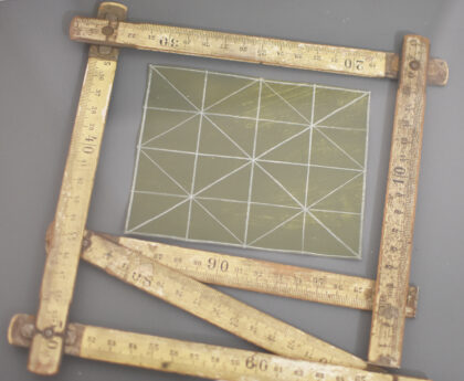 Med i utställningen finns också den tumstock Prinsen använde för att måtta med i landskapet inför en målning, här kompletterad av Matts Leiderstam med en konstvetenskaplig association till perspektivmåleriet i form av ett rutat papper.