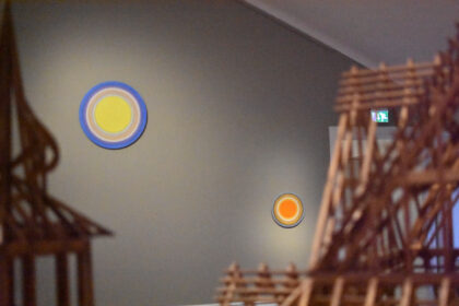 Två av Matts Leiderstams solar, utställda i samma rum som konstruktionsmodellen till Kiruna kyrka. Foto Kerstin Lager.