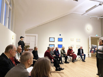 Karin Sidén berättade om Prinsens förstudie som åter monterats på den vägg där Prinsen arbetade med den. Foto Kerstin Lager.